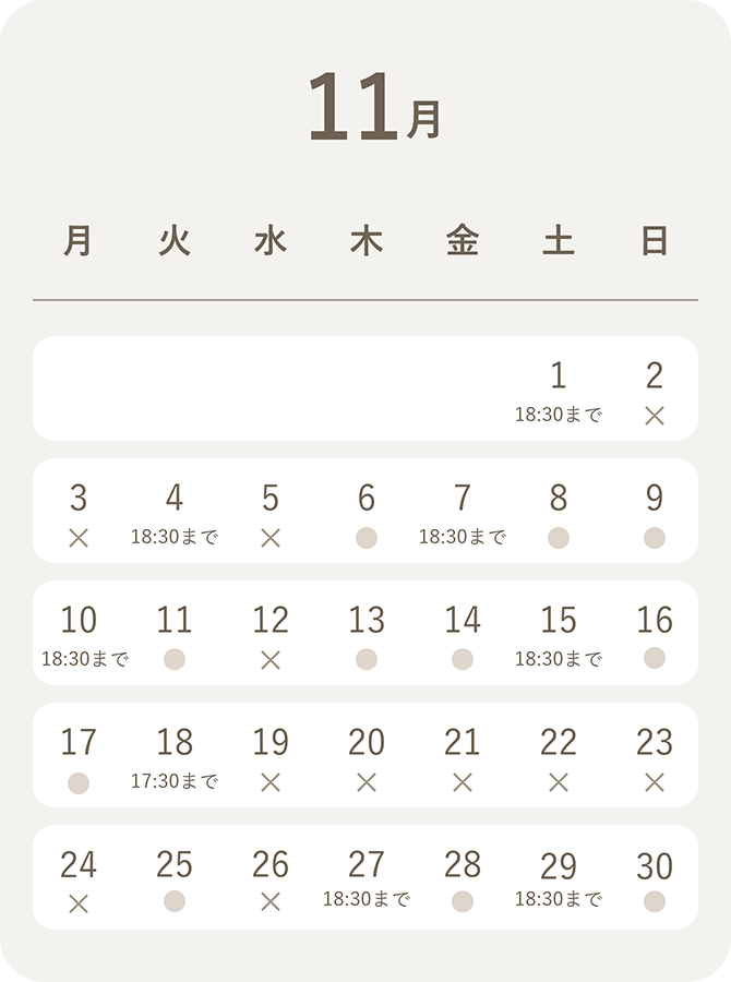 - 受付終了時間が週ごとに曜日などで変更しております。時間記入なしは今まで通り19:30までとします。